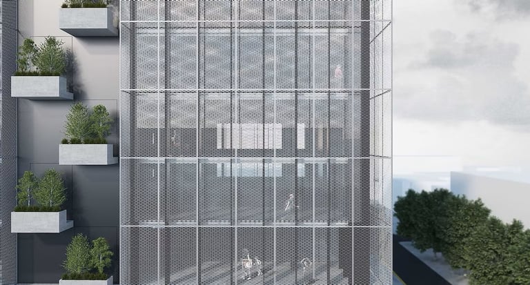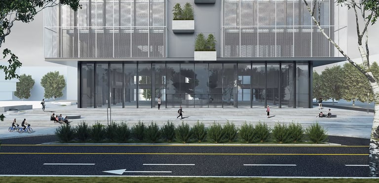 A young and sustainable language energizes the presence, transmitting its inviting and easy accessibility. A perforated metal mesh envelope, as a second skin, wraps all around the glazed volume, protecting from the sun and highlighting the permeability of the center. A flux of fluid energy runs without boundaries between inside and outside. The outdoor public space acquires with the new layout a new meaning, becoming extension of the library’s cultural and entertainment activities. The green extends vertically, punctuating the façade. A double high volume welcomes those who enter and a wide central stairwell, core of the library, floods the ambience with natural light. The 8 storey building offers a green roof top that could be used for events. The comfortable and functional space, open to a wide range of community’s needs, combines the lively atmosphere of hospitality with the quietness required for study and read. Outdoor green areas and the visual connection with the plants growing along the façade guarantee the harmony to work in a nature-like environment.